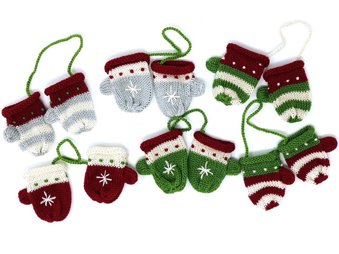 Set of 6 Hand knit Tiny Mitten Ornaments, Fair Trade