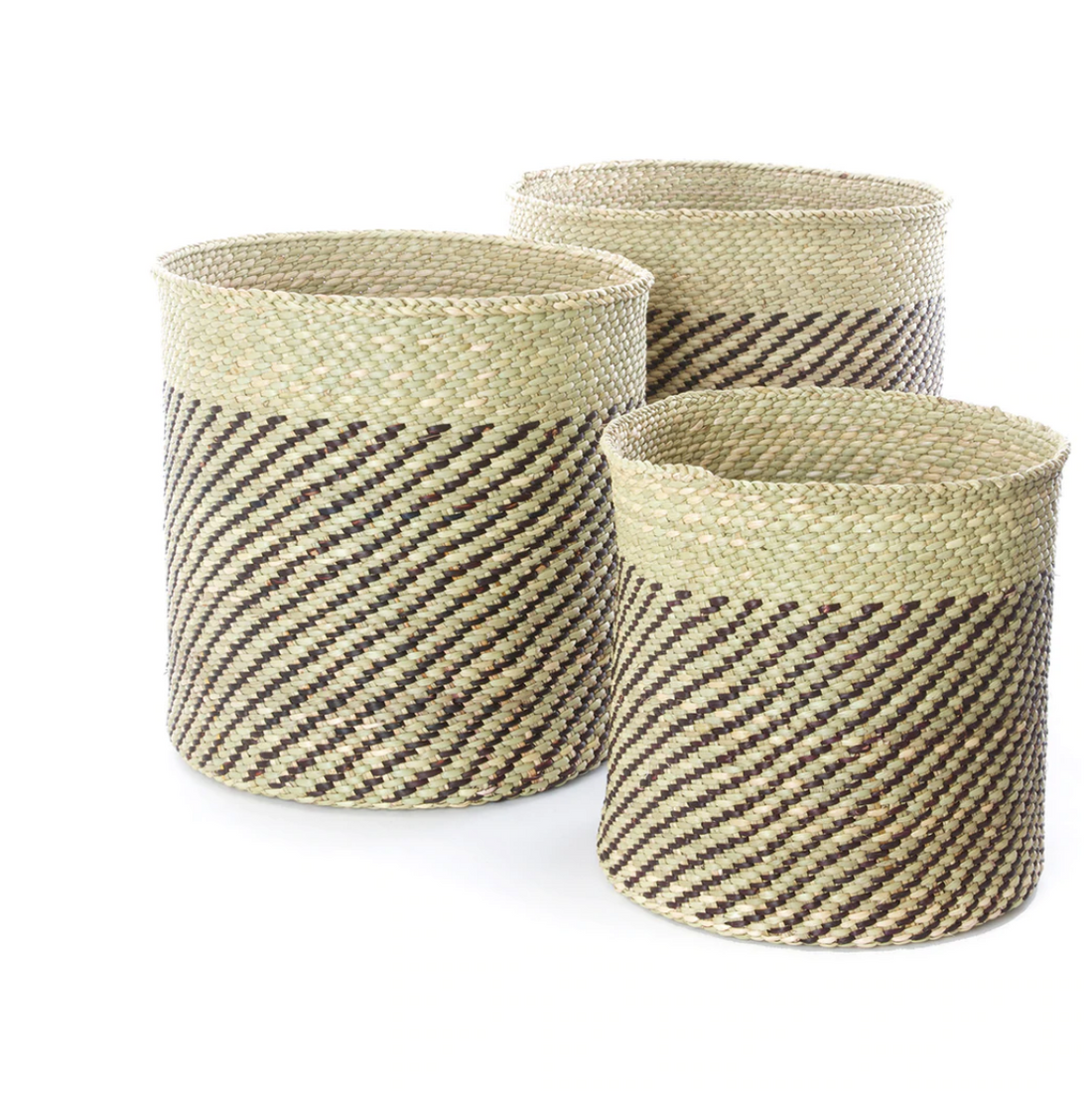 Handwoven Natural Grass Storage Baskets, Black Diagonal Accents, Fair Trade- Tanzania