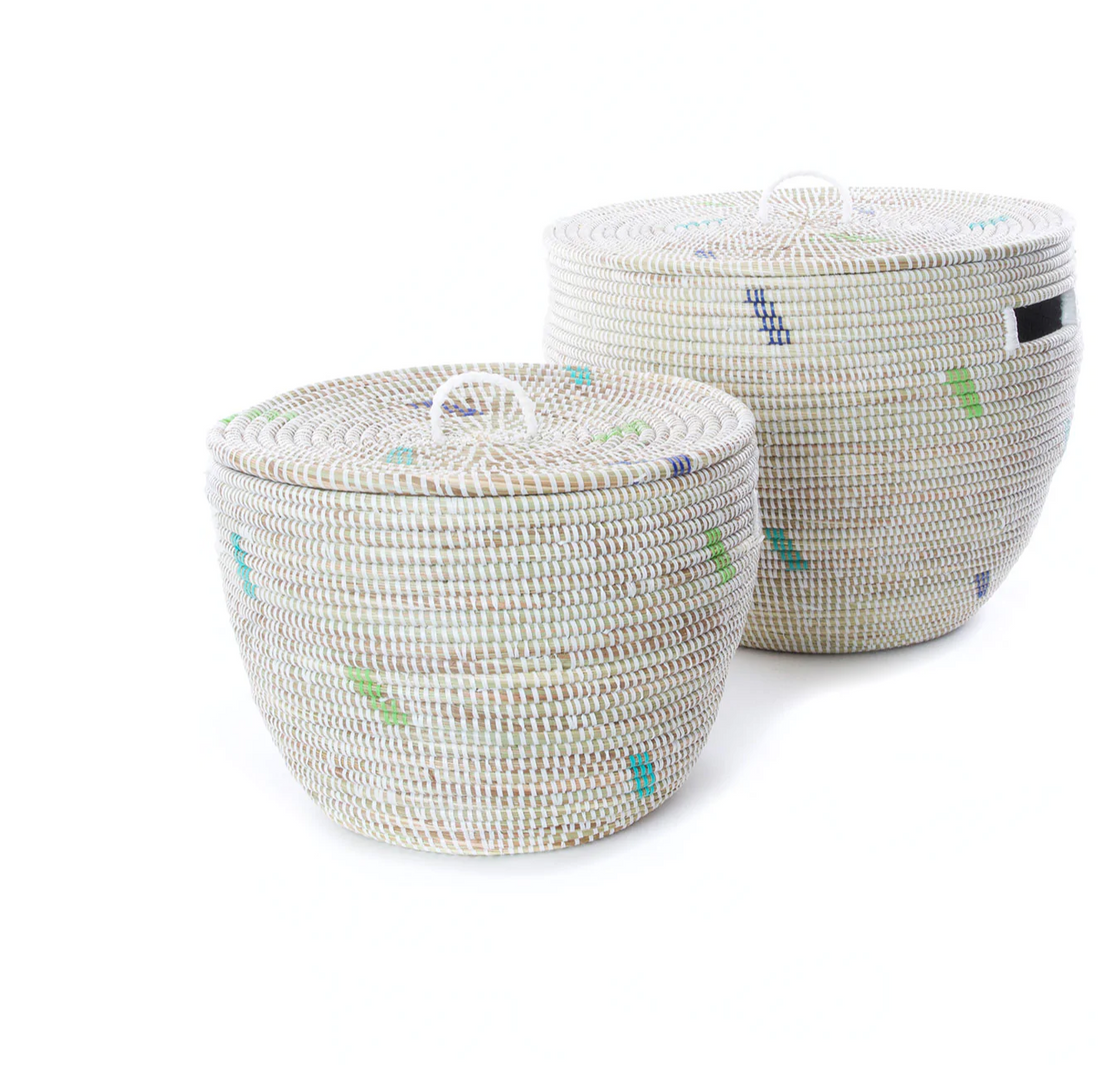 Set of 2 White with Green & Blue Dashes Handwoven African Decorative Storage Basket, Fair Trade