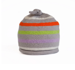 Striped Grey, Red, Green Hand Knit Baby Hat with curled knot top , Fair Trade