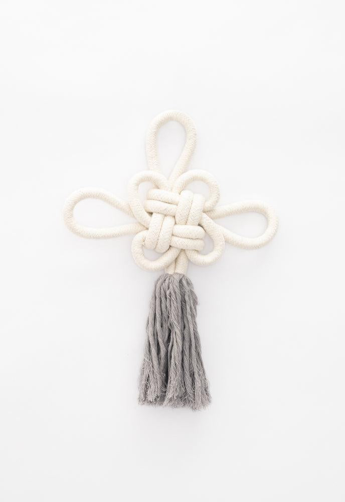 Medium 11" x 4.5" Handmade White Knot Rope, Grey Tassel Wall Hanging, Fair trade, Gives Freedom to Women