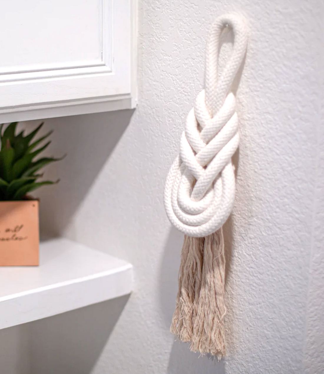 Medium 11" x 4.5" Handmade White Knot Rope Wall Hanging, Fair trade, Gives Freedom to Women
