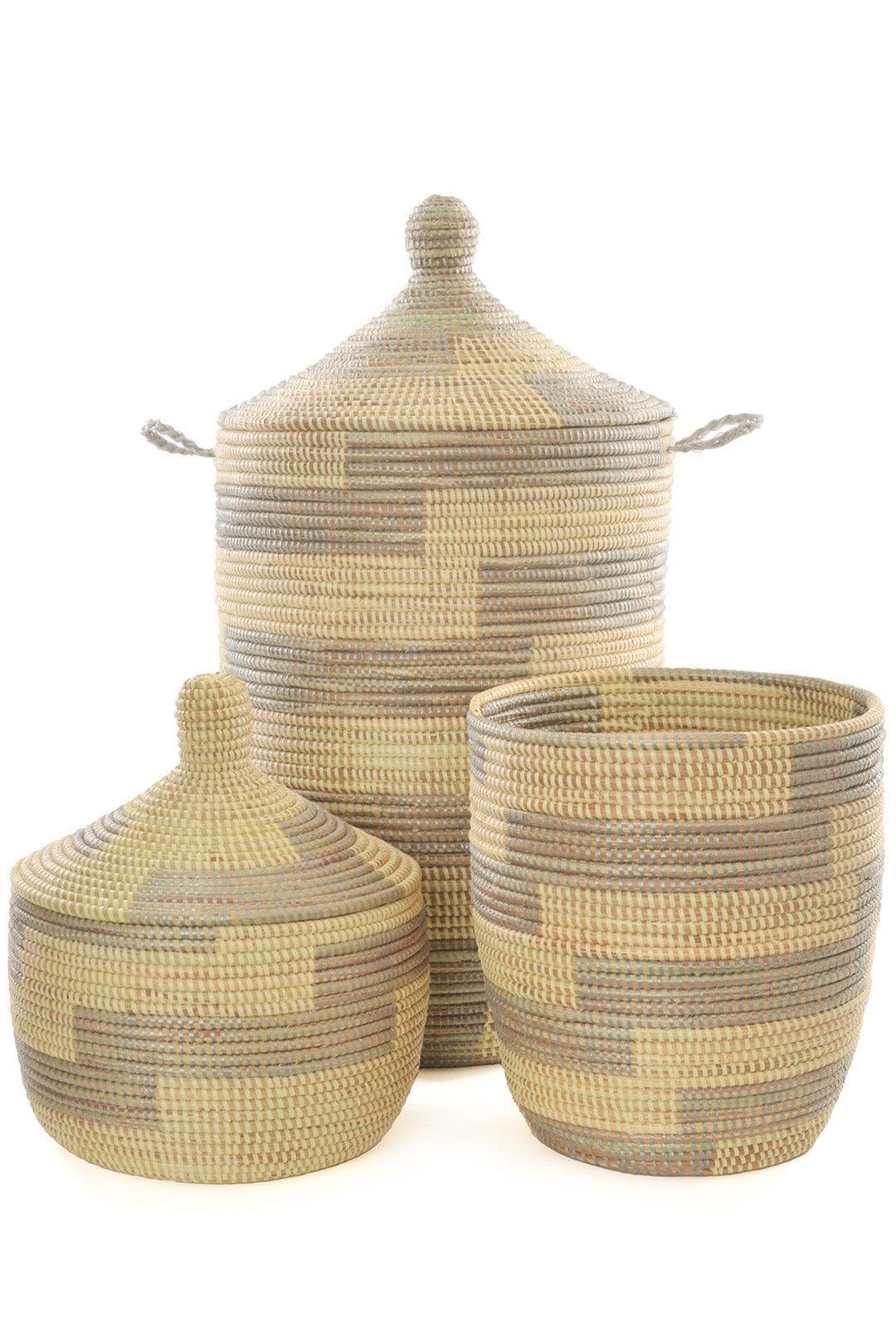 Three-Piece Hand Woven Silver & Cream Mixed Sized Basket Set, Fair Trade, Senegal