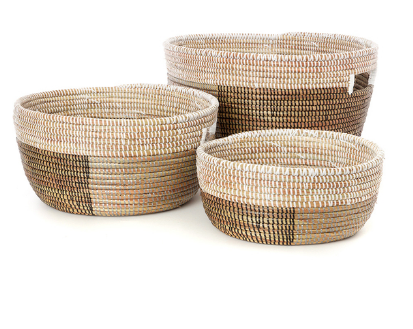 Set of 3 Large Handwoven Brown & White Mixed Storage Baskets, Fairtrade from Senegal