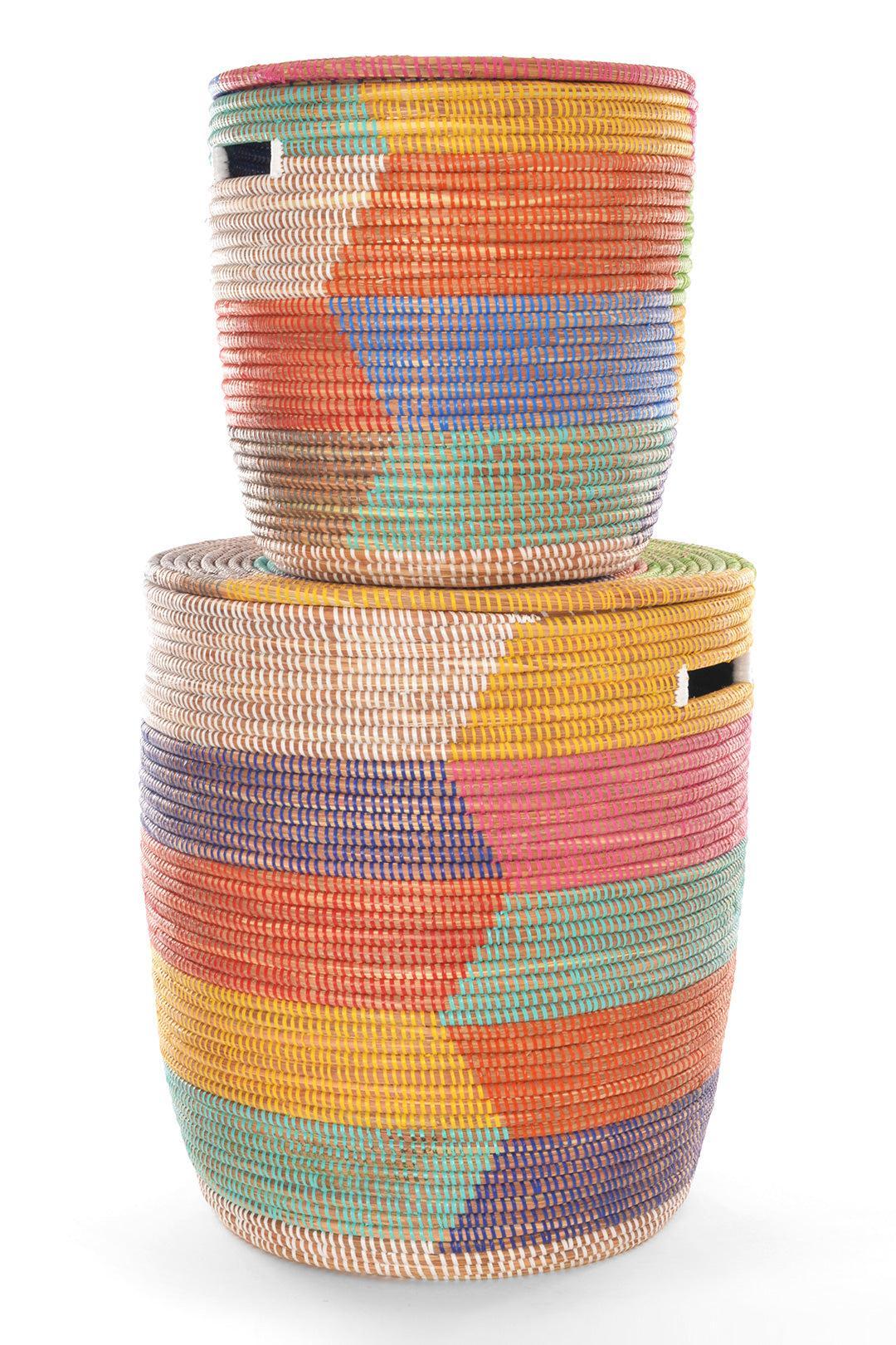 Set of Two Handwoven Rainbow Herringbone Hamper Baskets, Fair Trade, Senegal