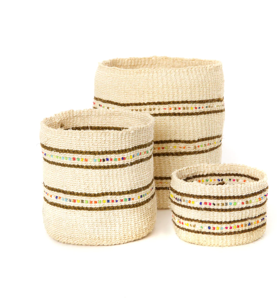 Set of 3 Handwoven Small Beige & Red Stripe beaded Sisal Baskets, Kenya, Fair Trade