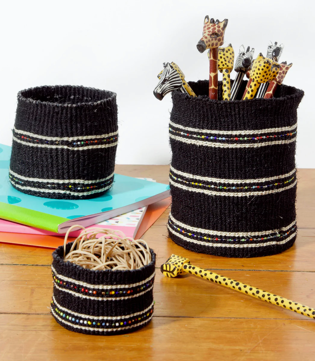 Set of 3 Small Desktop Handwoven Black Beaded Baskets, Kenya, Fair Trade