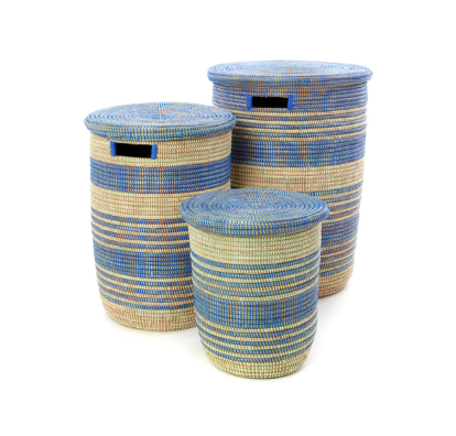 Set of Three Hamper Storage Baskets, Blue Striped Handwoven, Fair Trade