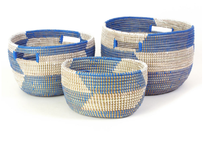 Set of Three Handwoven Blue & Natural Nesting Sewing Baskets, Fair Trade