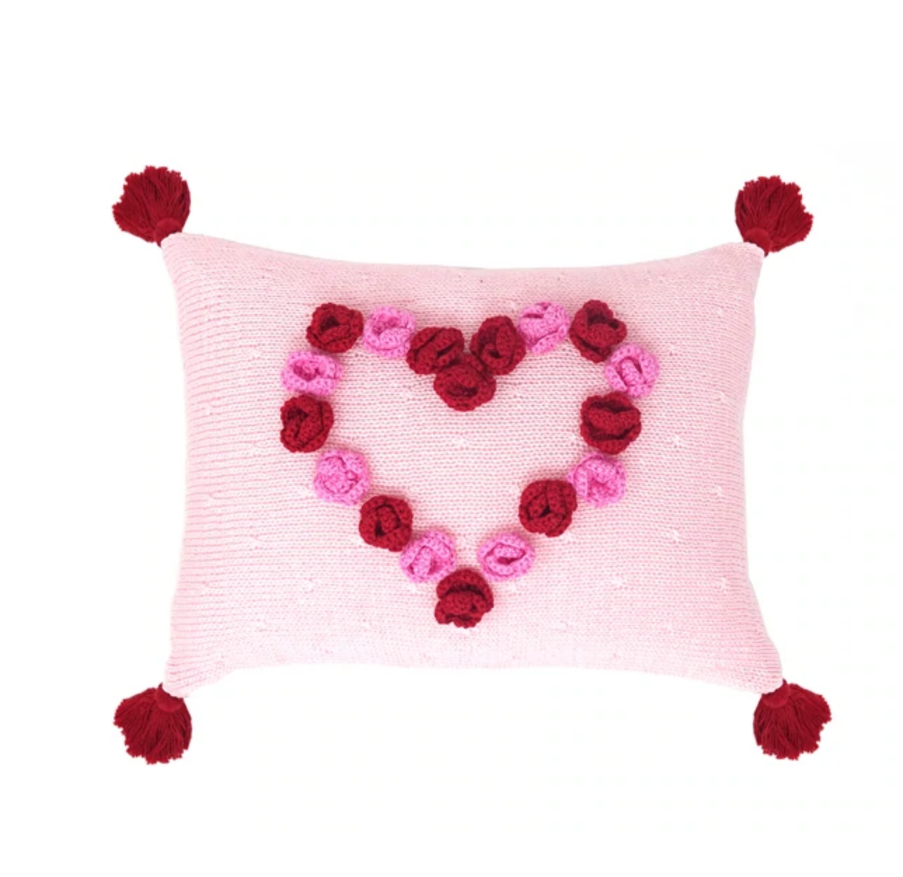 18" x 11" Handknit Pink Heart Valentine Pillow with poms, Fair Trade