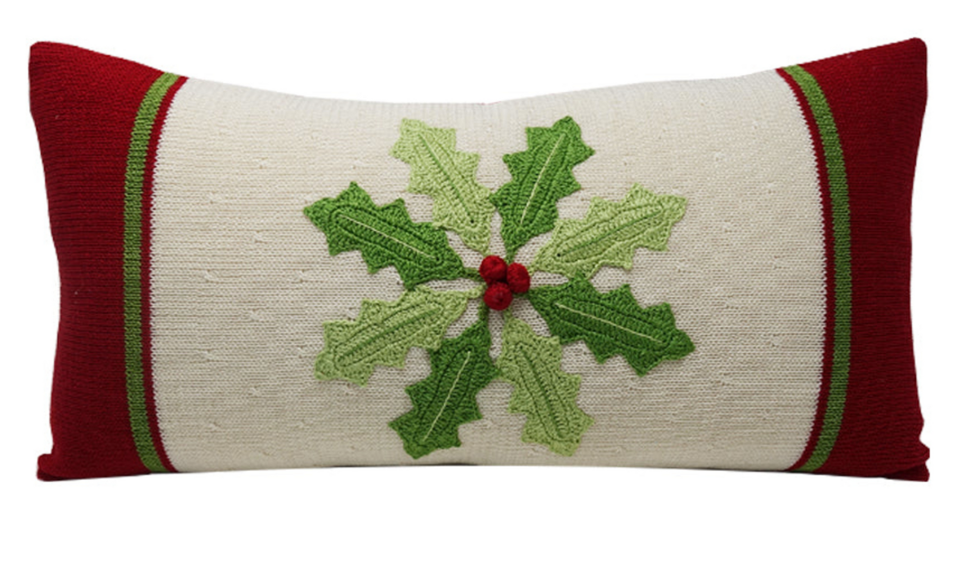 Hand Knit Christmas Lumbar Pillow, With Green Holly, Armenia- Fair Trade